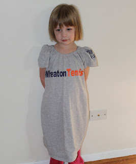First, I'll say that I definitely need to shorten this dress. But Riley was soaked from playing in the Wheaton fountain, so it was the opportune time to change her. I'll try to get better pictures later when I get that hem done. But anyway, this is what you'll start with-- a t-shirt: